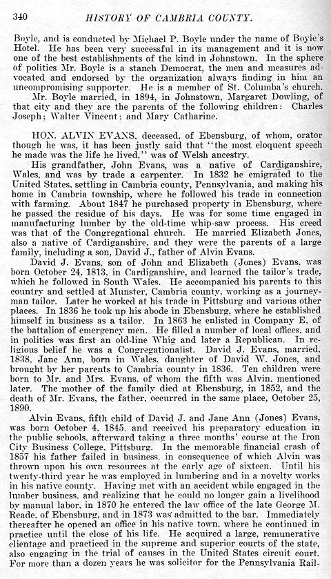 David J. Evans, son of John and Elizabeth (Jones) Evans, was born October 24, 1813, in Cardiganshire, and learned the tailor's trade, which he followed in South Wales. He accompanied his parents to this country and settled at Munster, Cambria county, working as a journeyman tailor. Later he worked at his trade in Pittsburg and various other places. In 1836 he took up his abode in Ebensburg, where he established himself in business as a tailor. In 1863 he enlisted in Company E, of the battalion of emergency men. He filled a number of local offices, and in politics was first an old-line Whig and later a Republican. In religious belief he was a Congregationalist. David J. Evans, married, 1838, Jane Ann, born in Wales, daughter of David W. Jones, and brought by her parents to Cambria county in 1836. Ten children were born to Mr. and Mrs. Evans, of whom the fifth was Alvin, mentioned later. The mother of the family died at Ebensburg, in 1852, and the death of Mr. Evans, the father, occurred in the same place, October 20, 1890.