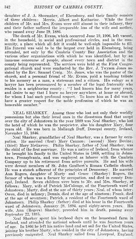 NEAL SHARKEY. Among those who lost not only their worldly possessions but also their loved ones in the disastrous flood that swept over the city of Johnstown in the year 1889 was Neal Sharkey, who lost the hotel of which he was the proprietor, also his daughter Mary, four years old. He was born in Mallaugh Duff, Donegal county, Ireland, November 15, 1846. |