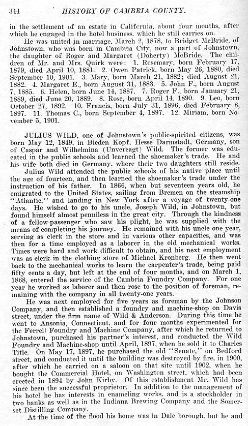 JULIUS WILD, one of Johnstown's public-spirited citizens, was born May 12, 1849, in Bieden Kopf, Hesse Darmstadt, Germany, son of Caspar and Wilhelmina (Unvercagt) Wild. The former was educated in the public schools and learned the shoemaker's trade. He and his wife both died in Germany, where their two daughters still reside.