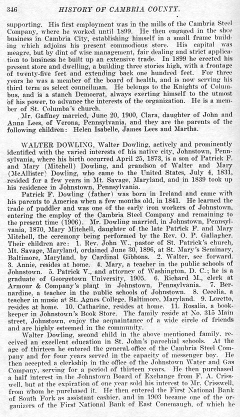 Patrick F. Dowling (father) was born in Ireland and came with his parents to America when a few months old, in 1841. He learned the trade of puddler and was one of the early iron workers of Johnstown, entering the employ of the Cambria Steel Company and remaining to the present time (1906). Mr. Dowling married, in Johnstown, Pennsylvania, 1870, Mary Mitchell, daughter of the late Patrick F. and Mary Mitchell, the ceremony being performed by the Rev. 0. P. Gallagher. Their children are: 1. Rev. John W., pastor of St. Patrick's church, Mt. Savage, Maryland, ordained June 30, 1896, at St. Mary's Seminary, Baltimore, Maryland, by Cardinal Gibbons. 2. Walter, see forward. 3. Annie, resides at home. 4. Mary, a teacher in the public schools of Johnstown. 5. Patrick V., and attorney of Washington, D. C.; he is a graduate of Georgetown University, 1905. 6. Richard M., clerk at Armour & Company's plant in Johnstown, Pennsylvania. 7. Bernardine. a teacher in the public schools of Johnstown. 8. Cecelia, a teacher in music at St. Agnes College, Baltimore, Maryland, 9. Loretto, resides at home. 10. Catharine, resides at home. 11. Rosalia, a bookkeeper in Johnstown's Book Store. The family reside at No. 315 Main street, Johnstown, enjoy the acquaintance of a wide circle of friends and are highly esteemed in the community.