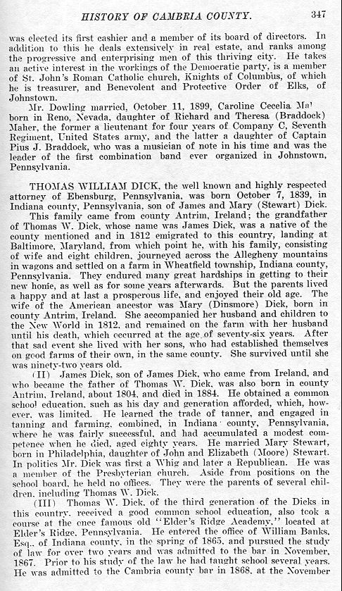 This family came from county Antrim, Ireland; the grandfather of Thomas W. Dick, whose name was James Dick, was a native of the county mentioned and in 1812 emigrated to this country, landing at Baltimore, Maryland, from which point he, with his family, consisting of wife and eight children, journeyed across the Allegheny mountains in wagons and settled on a farm in Wheatfield township, Indiana county, Pennsylvania. They endured many great hardships in getting to their new home, as well as for some years afterwards. But the parents lived a happy and at last a prosperous life, and enjoyed their old age. The wife of the American ancestor was Mary (Dinsmore) Dick, born in county Antrim, Ireland. She accompanied her husband and children to the New World in 1812, and remained on the farm with her husband until his death, which occurred at the age of seventy-six years. After that sad event she lived with her sons, who had established themselves on good farms of their own, in the same county. She survived until she was ninety-two years old.