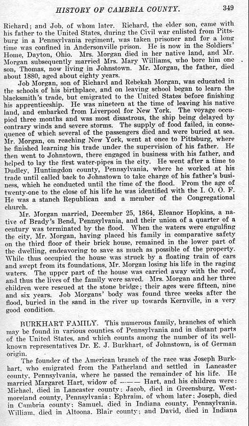 Richard; and Job, of whom later. Richard, the elder son, came with his father to the United States, during the Civil war enlisted from Pittsburg in a Pennsylvania regiment, was taken prisoner and for a long time was confined in Andersonville prison. He is now in the Soldiers' Home, Dayton, Ohio. Mrs. Morgan died in her native land, and Mr. Morgan subsequently married Mrs. Mary Williams, who bore him one son, Thomas, now living in Johnstown. Mr. Morgan, the father, died about 1880, aged about eighty years. Job Morgan, son of Richard and Rebekah Morgan, was educated in the schools of his birthplace, and on leaving school began to learn the blacksmith's trade, but emigrated to the United States before finishing his apprenticeship. He was nineteen at the time of leaving his native land, and embarked from Liverpool for New York. The voyage occupied three months and was most disastrous, the ship being delayed by contrary winds and severe storms. The supply of food failed, in consequence of which several of the passengers died and were buried at sea. Mr. Morgan, on reaching New York, went at once to Pittsburg, where he finished learning his trade under the supervision of his father. He then went to Johnstown, there engaged in business with his father, and helped to lay the first water-pipes in the city. He went after a time to Dudley, Huntingdon county, Pennsylvania, where he worked at his trade until called back to Johnstown to take charge of his father's business, which he conducted until the time of the flood. From the age of twenty-one to the close of his life, he was identified with the I. 0. 0. F. He was a stanch Republican and a member of the Congregational church. Mr. Morgan married, December 27, 1864, Eleanor Hopkins, a native of Brady's Bend, Pennsylvania, and their union of a quarter of a century was terminated by the flood. When the waters were engulfing the city, Mr. Morgan, having placed his family in comparative safety on the third floor of their brick house, remained in the lower part of the dwelling, endeavoring to save as much as possible of the property. While thus occupied the house was struck by a floating train of cars and swept from its foundations, Mr. Morgan losing his life in the raging waters. The upper part of the house was carried away with the roof, and thus the lives of the family were saved. Mrs. Morgan and her three children were rescued at the stone bridge; their ages were fifteen, nine and six years. Job Morgans' body was found three weeks after the flood, buried in the sand in the river up towards Kernville, in a very good condition.