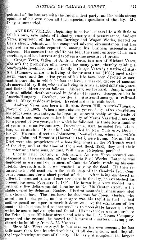 ANDREW VERES. Beginning in active business life with little to call his own, save habits of industry, energy and perseverance, Andrew Veres, proprietor of the Veres Carriage and Wagon Works, located on Davis street, Johnstown, has conquered adverse circumstances and has acquired an enviable reputation among his business associates and patrons. His success through life has been the result entirely of his own exertions, and he deserves and receives a due measure of praise.