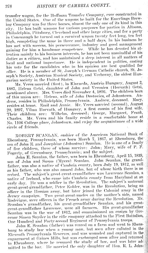 transfer wagon, for the Hoffman Transfer Company, ever constructed in the United States. One of the wagons he built for the Emerlings Brewing Company was for three horses, almost the only one of its kind in this city. He has built wagons for various purposes for parties in Altoona, Philadelphia, Pittsburg, Cleveland and other large cities, and for a party in Conemaugh he turned out a carnival wagon twenty feet long, ten feet high, completing the same in three and a half days. In his business he has met with success, his perseverance, industry and good management gaining for him a handsome competence. While he has devoted his attention mainly to his business interests, he has not been unmindful of his duties as a citizen, and has maintained a deep interest in all matters of local and national importance. He is independent in politics, casting his vote for the candidates who in his opinion are best qualified for office. He is a member of St. Joseph's German Catholic church, St. Joseph's Society, Austrian Musical Society, and Verhovay, the oldest Hungarian society in the United States. Mr. Veres married (first), in Kisvarda, Austria-Hungary, August 2, 1887, Helena Getzi, daughter of John and Veronica (Horvath) Getzi, mentioned above. Mrs. Veres died November 4, 1896. The children born of this union are: Helena, wife of John Drotovics, of Johnstown. Andrew, resides in Philadelphia, Pennsylvania. Andrew, deceased. Mary, resides at home. Emil and Annie. Mr. Veres married (second), August 20, 1897, Vilma Horvath, of Hungary, a first cousin of his first wife. Their children are: Wilhelm, deceased; George, Margaret, Frank, Charles. Mr. Veres and his family reside in a comfortable home at No. 1106 College place, Johnstown, and enjoy the acquaintance of a wide circle of friends.