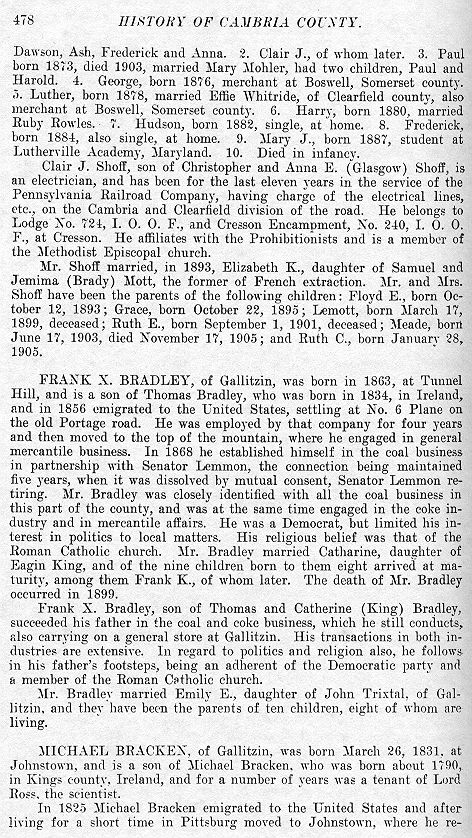 FRANK N. BRADLEY, of Gallitzin, was born in 1863, at Tunnel Hill, and is a son of Thomas Bradley, who was born in 1834, in Ireland, and in 1856 emigrated to the United States, settling at No. 6 Plane on the old Portage road. He was employed by that company for four years and then moved to the top of the mountain, where he engaged in general mercantile business. In 1868 he established himself in the coal business in partnership with Senator Lemmon, the connection being maintained five years, when it was dissolved by mutual consent, Senator Lemmon retiring. Mr. Bradley was closely identified with all the coal business in this part of the county, and was at the same time engaged in the coke industry and in mercantile affairs. He was a Democrat, but limited his interest in politics to local matters. His religious belief was that of the Roman Catholic church. Mr. Bradley married Catharine, daughter of Eagin King, and of the nine children born to them eight arrived at maturity, among them Frank K., of whom later. The death of Mr. Bradley occurred in 1899.