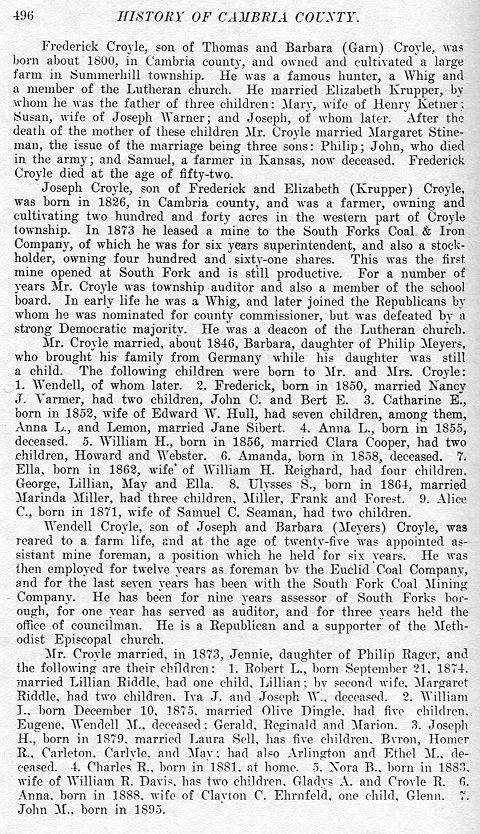 Frederick Croyle, son of Thomas and Barbara (Garn) Croyle, was born about 1800, in Cambria county, and owned and cultivated a large farm in Summerhill township. He was a famous hunter, a Whig and a member of the Lutheran church. He married Elizabeth Krupper, by whom he was the father of three children: Mary, wife of Henry Ketner; Susan, wife of Joseph Warner; and Joseph, of whom later. After the death of the mother of these children Mr. Croyle married Margaret Stineman, the issue of the marriage being three sons: Philip; John, who died in the army; and Samuel, a farmer in Kansas, now deceased. Frederick Croyle died at the age of fifty-two. Joseph Croyle, son of Frederick and Elizabeth (Krupper) Croyle, was born in 1826, in Cambria county, and was a farmer, owning and cultivating two hundred and forty acres in the western part of Croyle township. In 1873 he leased a mine to the South Forks Coal & Iron Company, of which he was for six years superintendent, and also a stockholder, owning four hundred and sixty-one shares. This was the first mine opened at South Fork and is still productive. For a number of years Mr. Croyle was township auditor and also a member of the school board. In early life he was a Whig, and later joined the Republicans by whom he was nominated for county commissioner, but was defeated by a strong Democratic majority. He was a deacon of the Lutheran church. Mr. Croyle married, about 1846, Barbara, daughter of Philip Meyers, who brought his family from Germany while his daughter was still a child. The following children were born to Mr. and Mrs. Croyle: 1. Wendell, of whom later. 2. Frederick, born in 1850, married Nancy J. Varmer, had two children, John C. and Bert E. 3. Catharine E., born in 1852, wife of Edward W. Hull, had seven children, among them, Anna L., and Lemon, married Jane Sibert. 4. Anna L., born in 1855, deceased. 5. William H., born in 1856, married Clara Cooper, had two children, Howard and Webster. 6. Amanda, born in 1858, deceased. 7. Ella, born in 1862, wife of William H. Reighard, had four children, George, Lillian, May and Ella. 8. Ulysses S., born in 1864, married Marinda Miller, had three children, Miller, Frank and Forest. 9. Alice C., born in 1871, wife of Samuel C. Seaman, had two children. Wendell Croyle, son of Joseph and Barbara (Meyers) Croyle, was reared to a farm life, and at the age of twenty-five was appointed assistant mine foreman, a position which he held for six years. He was then employed for twelve years as foreman by the Euclid Coal Company, and for the last seven years has been with the South Fork Coal Mining Company. He has been for nine years assessor of South Forks borough, for one year has served as auditor, and for three years held the office of councilman. He is a Republican and a supporter of the Methodist Episcopal church. Mr. Croyle married, in 1873, Jennie, daughter of Philip Rager, and the following are their children: 1. Robert L., born September 21, 1874, married Lillian Riddle, had one chill, Lillian; by second wife, Margaret Riddle, had two children, Iva, J. and Joseph W., deceased. 2. William I., born December 10, 1875, married Olive Dingle, had five children, Eugene, Wendell M., deceased; Gerald, Reginald and Marion. 3. Joseph H., born in 1879, married Laura Sell, has five children, Byron, Homer R., Carleton, Carlyle, and May; had also Arlington and Ethel M., deceased. 4. Charles R., born in 1881, at home. 5. Nora B., born in 1883, wife of William R. Davis, has two children. Gladys A. and Croyle R. 6. Anna, born in 1888, wife of Clayton C. Ehrnfeld, one child, Glenn. 7. John M., born in 1895. |