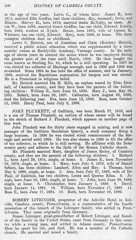 at the age of two years. Lewis C., of whom later. James B., born 1875, married Effie Graffus, had three children: Ray, deceased; Irvin, and Minnie. Harvey H., born 1878, married Sadie McNulty, no issue. Alvin W., born 1882, married Grace Graffus, has one child, Edward. Estella, born 1853, student at Nyack. Ressie, born 1885, wife of Carson K. Whitmer, has one child, Edward. Mary, born 1889, at home. The three youngest children died in childhood. Lewis C. Hetrick, son of Jonathan and Clara (Keister) Hetrick, received a public school education which was supplemented by a three months' course at Barklyville Academy, Venango county. At the early age of eleven years he entered the mines where he was employed during the greater part of the time until March, 1902. He then bought the mine known as Sterling No. 10, which he is still operating. In 1897 he was elected tax collector of Hastings borough, and in 1900 and 1903 was re-elected. Since 1904 he has held the office of assessor, and in January, 1906, received the Republican nomination for burgess and was elected. He is a Protestant in religious belief. Mr. Hetrick married Ida M. Mills, an orphan reared by Elias Driskall, of Cambria county, and they have been the parents of the following children: William E., born June 24, 1893. Mary J., born May 26, 1895. Robert, born June 20, 1897. Catharine, born August 20, 1899, died the following year. Eva, born June 12, 1900. Rose, born October 15, 1903. Harry Paul, born July 6, 1906.