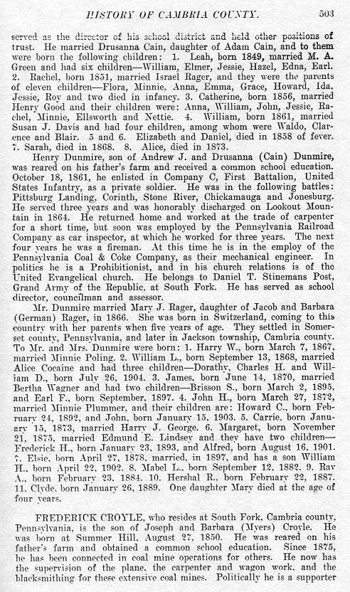 served as the director of his school district and held other positions of trust. He married Drusanna Cain, daughter of Adam Cain, and to them were born the following children: 1. Leah, born 1849, married M. A. Green and had six children--William, Elmer, Jessie, Hazel, Edna, Earl. 2. Rachel, born 1851, married Israel Rager, and they were the parents of eleven children -- Flora, Minnie, Anna, Emma, Grace, Howard, Ida, Jessie, Roy and two died in infancy. 3. Catherine, born 1856, married Henry Good and their children were: Anna, William, John, Jessie, Rachel, Henry Ellsworth and Nettie. 4. William, born 1861, married Susan J. Davis and had four children, among whom were Waldo, Clarence and Blair. 5 and 6. Elizabeth and Daniel, died in 1858 of fever. Sarah, died in 1868. 8. Alice, died in 1873. Henry Dunmire, son of Andrew J. and Drusanna (Cain) Dunmire, was reared on his father's farm and received a common school education. October 18, 1861, he enlisted in Company C, First Battalion, United States Infantry, as a private soldier. He was in the following battles: Pittsburg Landing, Corinth, Stone River, Chickamauga and Jonesburg. He served three years and was honorably discharged on Lookout Mountain in 1864. He returned home and worked at the trade of carpenter for a short time, but soon was employed by the Pennsylvania Railroad Company as car inspector, at which he worked for three years. The next four years he was a fireman. At this time he is in the employ of the Pennsylvania Coal & Coke Company, as their mechanical engineer. In politics he is a Prohibitionist, and in his church relations is of the United Evangelical church. He belongs to Daniel T. Stinemans Post, Grand Army of the Republic, at South Fork. He has served as school director, councilman and assessor. Mr. Dunmire married Mary J. Rager, daughter of Jacob and Barbara (German) Rager, in 1866. She was born in Switzerland, coming to this country with her parents when five years of age. They settled in Somerset county, Pennsylvania, and later in Jackson township, Cambria county. To Mr. and Mrs. Dunmire were born: 1. Harry W., born March 7, 1867, married Minnie Poling. 2. William L., born September 13, 1868, married Alice Cocaine and had three children--Dorathy, Charles H. and William D., born July 26, 1904. 3. James, born June 14, 1870, married Bertha Wagner and had two children--Brisson S., born March 2, 1895, and Earl F., born September, 1897. 4. John H., born March 27, 1872, married Minnie Plummer, and their children are: Howard C., born February 24, 1892, and John, born January 15, 1903. 5. Carrie, born January 15, 1873, married Harry J. George. 6. Margaret, born November 21, 1875, married Edmund E. Lindsey and they have two children Frederick H., born January 23, 1893, and Alfred, born August 16, 1901. 7. Elsie, born April 27, 1878, married, in 1897, and has a son William H., born April 22, 1902. 8. Mabel L., born September 12, 1882. 9. Ray A., born February 23, 1884. 10. Hershal R., born February 22, 1887. 11. Clyde, born January 26, 1889. One daughter Mary died at the age of four years. FREDERICK CROYLE, who resides at South Fork, Cambria county, Pennsylvania, is the son of Joseph and Barbara (Myers) Croyle. He was born at Summer Hill, August 27, 1850. He was reared on his father's farm and obtained a common school education. Since 1875, he has been connected in coal mine operations for others. He now has the supervision of the plane, the carpenter and wagon work, and the blacksmithing for these extensive coal mine. Politically he is a supporter |