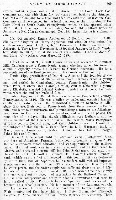 Daniel A. Sipe, eldest child of Peter and Maria (Pottsgrove) Sipe, was born at Allegheny Furnace, Blair county, Pennsylvania, in 1839. He had a common school education, and was apprenticed to the miller's trade. His first work was in his native county, and he then went to Altoona and operated a steam mill for John Steinbarger. He next purchased the old Croyle mill at Summer Hill, Cambria county, Pennsylvania, which was the first mill erected in this county. It was destroyed by fire in 1893, and Mr. Sipe then built a modern mill with all improvements, on the site of the old one. This he still operates. It is operated by water power, and the water supply was sufficient always to grind fifty bushels of wheat in a day up until 1902, since which time the supply at times runs short on account of excavations by the Railroad Company. He has been enterprising and ready to adopt all inventions that seem to have practical utility. Politically he is a Republican, and has served his boroough as a school director. He is a member of the Lutheran church.