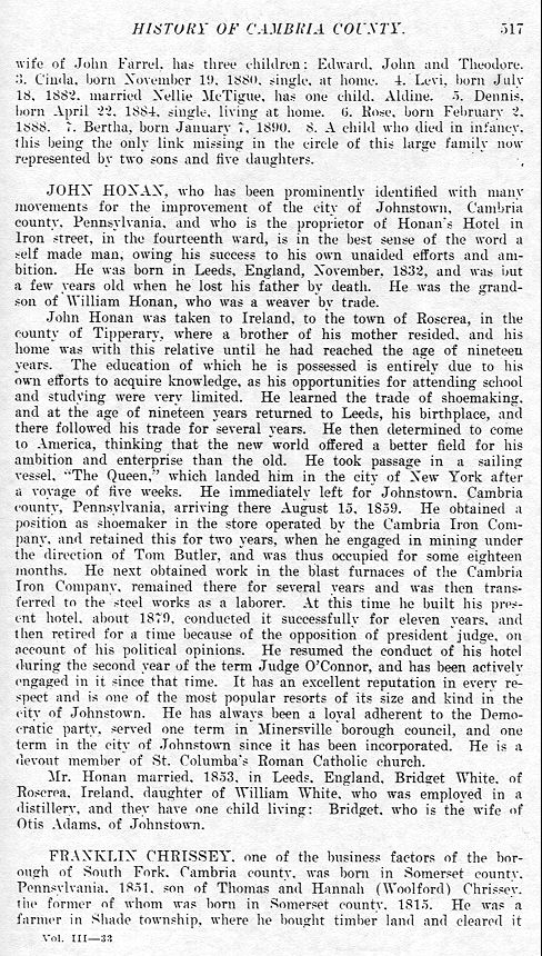 John Honan was taken to Ireland, to the town of Roscrea, in the county of Tipperary, where a brother of his mother resided, and his home was with this relative until he had reached the age of nineteen years. The education of which he is possessed is entirely due to his own efforts to acquire knowledge, as his opportunities for attending school and studying were very limited. He learned the trade of shoemaking and at the age of nineteen years returned to Leeds, his birthplace, and there followed his trade for several years. He then determined to come to America, thinking that the new world offered a better field for his ambition and enterprise than the old. He took passage in a sailing vessel, "The Queen," which landed him in the city of New York after a voyage of five weeks. He immediately left for Johnstown, Cambria county, Pennsylvania, arriving there August 15, 1859. He obtained a position as shoemaker in the store operated by the Cambria Iron Company, and retained this for two years, when he engaged in mining under the direction of Tom Butler, and was thus occupied for some eighteen months. He next obtained work in the blast furnaces of the Cambria Iron Company, remained there for several years and was then transferred to the steel works as a laborer. At this time he built his present hotel, about 1879, conducted it successfully for eleven years, and then retired for a time because of the opposition of president judge, on account of his political opinions. He resumed the conduct of his hotel during the second year of the term Judge O'Connor, and has been actively engaged in it since that time. It has an excellent reputation in every respect and is one of the most popular resorts of its size and kind in the city of Johnstown. He has always been a loyal adherent to the Democratic party, served one term in Minersville borough council, and one term in the city of Johnstown since it has been incorporated. He is a devout member of St. Columba's Roman Catholic church.
