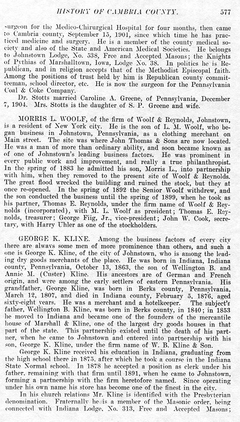 surgeon for the Medico-Chirurgical Hospital for four months, then came to Cambria county, September 15, 1901, since which time he has practiced medicine and surgery. He is a member of the county medical society and also of the State and American Medical Societies. He belongs to Johnstown Lodge, No. 538, Free and Accepted Masons; the Knights of Pythias of Marshalltown, Iowa, Lodge No. 38. In politics he is Republican, and in religion accepts that of the Methodist Episcopal faith. Among the positions of trust held by him is Republican county committeeman, school director, etc. He is now the surgeon for the Pennsylvania Coal & Coke Company. Dr. Stotts married Caroline A. Greene, of Pennsylvania, December 7, 1901. Mrs. Stotts is the daughter of S. P. Greene and wife. MORRIS L. WOOLF, of the firm of Woolf & Reynolds, Johnstown, is a resident of New York city. He is the son of L. M. Woolf, who began business in Johnstown, Pennsylvania, as a clothing merchant on Main street. The site was where John Thomas &, Sons are now located. He was a man of more than ordinary ability, and soon became known as of one of Johnstown's leading business factors. He was prominent in every public work and improvement, and really a true philanthropist. In the spring of 1883 he admitted his son, Morris L., into partnership with him, when they removed to the present site of Woolf & Reynolds. The great flood wrecked the building and ruined the stock, but they at once reopened. In the spring of 1892 the Senior Woolf withdrew, and the son conducted the business until the spring of 1899, when he took as his partner, Thomas E. Reynolds, under the firm name of Woolf & Reynolds (incorporated), with M. L. Woolf as president; Thomas E. Reynolds, treasurer; George Fiig, Jr., vice-president; John W. Cook, secretary, with Harry Uhler as one of the stockholders.