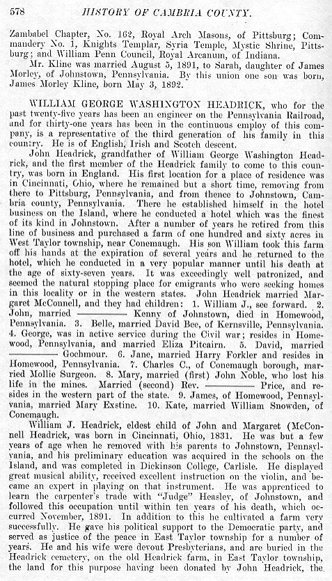 John Headrick, grandfather of William George Washington Headrick, and the first member of the Headrick family to come to this country, was born in England. His first location for a place of residence was in Cincinnati, Ohio, where he remained but a short time, removing from there to Pittsburg, Pennsylvania, and from thence to Johnstown, Cambria county, Pennsylvania. There he established himself in the hotel business on the Island, where he conducted a hotel which was the finest of its kind in Johnstown. After a number of years he retired from this line of business and purchased a farm of one hundred and sixty acres in West Taylor township, near Conemaugh. His son William took this farm off his hands at the expiration of several years and he returned to the hotel, which he conducted in a very popular manner until his death at the age of sixty-seven years. It was exceedingly well patronized, and seemed the natural stopping place for emigrants who were seeking homes in this locality or in the western states. John Headrick married Margaret McConnell, and they had children: 1. William J., see forward. 2. John, married ------- Kenny of Johnstown, died in Homewood, Pennsylvania. 3. Belle, married David Bee, of Kernsville, Pennsylvania. 4. George, was in active service during the Civil war; resides in Homewood, Pennsylvania, and married Eliza Pitcairn. 5. David, married ----- Gochmour. 6. Jane, married Harry Forkler and resides in Homewood, Pennsylvania. 7. Charles C., of Conemaugh borough, married Mollie Surgeon. 8. Mary, married (first) John Noble, who lost his life in the mines. Married (second) Rev. ------- Price, and resides in the western part of the state. 9. James, of Homewood, Pennsylvania, married Mary Exstine. 10. Kate, married William Snowden, of Conemaugh.
