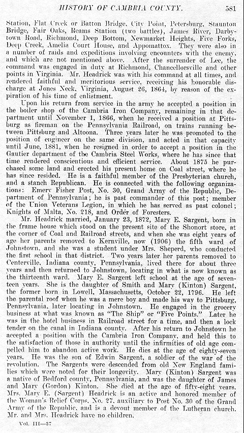 Station, Flat Creek or Batton Bridge, City Point, Petersburg, Staunton Bridge, Fair Oaks, Reams Station (two battles), James River, Darbytown Road, Richmond, Deep Bottom, Newmarket Heights, Five Forks, Deep Creek, Amelia Court House, and Appomattox. They were also in a number of raids and expeditions involving encounters with the enemy, and which are not mentioned above. After the surrender of Lee, the command was engaged in duty at Richmond. Chancellorsville and other points in Virginia. Mr. Headrick was with his command at all times, and rendered faithful and meritorious service, receiving his honorable discharge at Jones Neck, Virginia, August 26, 1864, by reason of the expiration of his time of enlistment. Upon his return from service in the army he accepted a position in the boiler shop of the Cambria Iron Company, remaining in that department until November 1, 1866, when he received a position at Pittsburg as fireman on the Pennsylvania Railroad, on trains running between Pittsburg and Altoona. Three years later he was promoted to the position of engineer on the same division, and acted in that capacity until June, 1881, when he resigned in order to accept a position in the Gautier department of the Cambria Steel Works; where he has since that time rendered conscientious and efficient service. About 1875 he purchased some land and erected his present home on Coal street, where he has since resided. He is a faithful member of the Presbyterian church, and a stanch Republican. He is connected with the following organizations: Emery Fisher Post, No. 30, Grand Army of the Republic, Department of Pennsylvania; he is past commander of this post; member of the Union Veterans Legion, in which he has served as past colonel; Knights of Malta, No. 218, and Order of Foresters. Mr. Headrick married, January 23, 1872, Mary E. Sargent, born in the frame house which stood on the present cite of the Shonort store, at the corner of Coal and Railroad streets, and when she was eight years of age her parents removed to Kernville, now (1906) the fifth ward of Johnstown, and she was a student under Mrs. Sheperd, who conducted the first school in that district. Two years later her parents removed to Centerville, Indiana county, Pennsylvania, lived there for about three years and then returned to Johnstown, locating in what is now known as the thirteenth ward. Mary E. Sargent left school at the age of seventeen years. She is the daughter of Smith and Mary (Kinton) Sargent, the former born in Lowell, Massachusetts, October 22, 1796. He left the parental roof when he was a mere boy and made his way to Pittsburg, Pennsylvania, later locating in Johnstown. He engaged in the grocer business at what was known as "The Ship" or "Five Points." Later he was in the hotel business in Railroad street for a time, and then a lock tender on the canal in Indiana county. After his return to Johnstown he accepted a position with the Cambria Iron Company, and held this to the satisfaction of those in authority until the infirmities of old age compelled him to abandon active work. He died at the age of eighty-seven years. He was the son of Edwin Sargent, a soldier of the war of the revolution. The Sargents were descended from old New England families which were noted for their longevity. Mary (Kinton) Sargent was a native of Bedford county, Pennsylvania, and was the daughter of James and Mary (Gordon) Kinton. She died at the age of fifty-eight years. Mrs. Mary E. (Sargent) Headrick is an active and honored member of the Woman's Relief Corps, No. 27, auxiliary to Post No. 30 of the Grand Army of the Republic, and is a devout member of the Lutheran church. Mr. and Mrs. Headrick have no children. |