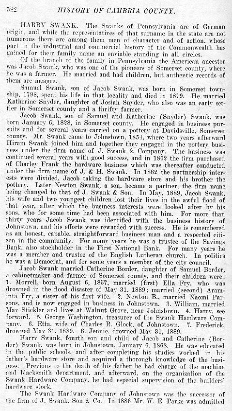 HARRY SWANK. The Swanks of Pennsylvania are of German origin, and while the representatives of that surname in the state are not numerous there are among them men of character and of action, whose part in the industrial and commercial history of the Commonwealth has gained for their family name an enviable standing in all circles. Of the branch of the family in Pennsylvania the American ancestor was Jacob Swank, who was one of the pioneers of Somerset county, where he was a farmer. He married and had children, but authentic records of them are meagre. Samuel Swank, son of Jacob Swank, was born in Somerset township, 1798, spent his life in that locality and died in 1879. He married Katherine Snyder, daughter of Josiah Snyder, who also was an early settler in Somerset county and a thrifty farmer. Jacob Swank, son of Samuel and Katherine (Snyder) Swank, was born January 6, 1828, in Somerset county. He engaged in business pursuits and for several years carried on a pottery at Davidsville, Somerset county. Mr. Swank came to Johnstown, 1854, where two years afterward Hiram Swank joined him and together they engaged in the pottery business under the firm name of J. Swank Company. The business was continued several years with good success, and in 1862 the firm purchased of Charley Frank the hardware business which was thereafter conducted under the firm name of J. & H. Swank. In 1882 the partnership interests were divided, Jacob taking the hardware store and his brother the pottery. Later Newton Swank, a son, became a partner, the firm name being changed to that of J. Swank & Son. In May, 1889, Jacob Swank, his wife and two youngest children lost their lives in the awful flood of that year, after which the business interests were looked after by his sons, who for some time had been associated with him. For more than thirty years Jacob Swank was identified with the business history of Johnstown, and his efforts were rewarded with success. He is remembered as an honest, capable, straightforward business man and a respected citizen in the community. For many years he was a trustee of the Savings Bank, also stockholder in the First National Bank. For many years he was a member and trustee of the English Lutheran church. In politics he was a Democrat, and for some years a member of the city council. Jacob Swank married Catherine Border, daughter of Samuel Border, a cabinetmaker and farmer of Somerset county, and their children were: 1. Morrell, born August 6, 1857, married (first) Ella Fry, who was drowned in the flood disaster of May 31, 1889; married (second) Araminta Fry, a sister of his first wife. 2. Newton B., married Naomi Parsons, and is now engaged in business in Johnstown. 3. William, married May Stickler and lives at Walnut Grove, near Johnstown. 4. Harry, see forward. 5. George Washington, treasurer of the Swank Hardware Company. 6. Etta, wife of Charles R. Glock, of Johnstown. 7. Frederick, drowned May 31, 1889. 8. Jennie, drowned May 31, 1889. Harry Swank, fourth son and child of Jacob and Catherine (Border) Swank, was born in Johnstown, January 6, 1868. He was educated in the public schools, and after completing his studies worked in his father's hardware store and acquired a thorough knowledge of the business. Previous to the death of his father he had charge of the machine and blacksmith department, and afterward, on the organization of the Swank Hardware Company, he had especial supervision of the builders' hardware stock. The Swank Hardware Company of Johnstown was the successor of the firm of J. Swank, Son & Co. In 1886 Mr. W. E. Parke was admitted |