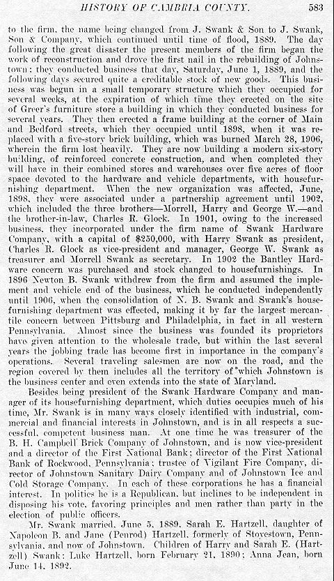 to the firm, the name being changed from J. Swank & Son to J. Swank, Son & Company, which continued until time of flood, 1559. The day following the great disaster the present members of the firm began the work of reconstruction and drove the first nail in the rebuilding of Johnstown; they conducted business that day, Saturday June 1, 1889, and the following days secured quite a creditable stock of new goods. This business was begun in a small temporary structure which they occupied for several weeks, at the expiration of which time they erected on the site of Greer's furniture store a building in which then conducted business for several years. They then erected a frame building at the corner of Main and Bedford street, which they occupied until 1898, when it was replaced with a five-story brick building, which was burned March 28, 1906, wherein the firm lost heavily. They are now building a modern six-story building, of reinforced concrete construction, and when completed they will have in their combined stores and warehouses over five acres of floor space devoted to the hardware and vehicle departments, with housefurnishing department. When the new organization was affected, June, 1898, they were associated under a partnership agreement until 1902, which included the three brothers--Morrell, Harry and George W.--and the brother-in-law, Charles R. Glock. In 1901, owing to the increased business, they incorporated under the firm name of Swank Hardware Company, with a, capital of $250,000, with Harry Swank as president, Charles M. Glock as vice-president and manager, George M. Swank as treasurer and Morrell Swank as secretary. In 1902 the Bantley Hardware concern was purchased and stock changed to housefurnishings. In 1896 Newton B. Swank withdrew from the firm and assumed the implement and vehicle end of the business, which he conducted independently until 1906, when the consolidation of N. B. Swank and Swank's housefurnishing department was effected, making it by far the largest mercantile concern between Pittsburg and Philadelphia, in fact in all western Pennsylvania. Almost since the business was founded its proprietors have given attention to the wholesale trade, but within the last several years the jobbing trade has become first in importance in the company's operations. Several traveling salesmen are now on the road, and the region covered by them includes all the territory of which Johnstown is the business center and even extends into the state of Maryland. Besides being president of the Swank Hardware Company and manager of its housefurnishing department, which duties occupies much of his time, Mr. Swank is in many ways closely identified with industrial, commercial and financial interests in Johnstown, and is in all respects a successful, competent business man. At one time he was treasurer of the B. H. Campbell Brick Company of Johnstown, and is now vice-president and a director of the First National Bank; director of the First National Bank of Rockwood, Pennsylvania; trustee of Vigilant Fire Company, director of Johnstown Sanitary Dairy Company and of Johnstown Ice and Cold Storage Company. In each of these corporations he has a financial interest. In politics he is a Republican, but inclines to be independent in disposing his vote, favoring principles and men rather than party in the election of public officers. Mr. Swank married, June 5, 1889, Sarah E. Hartzell. daughter of Napoleon B. and Jane (Penrod) Hartzell, formerly of Stoyestown, Pennsylvania, now of Johnstown. Children of Harry and Sarah E. (Hartzell) Swank: Luke Hartzell, born February 21, 1890; Anna Jean, born June 14, 1892. |