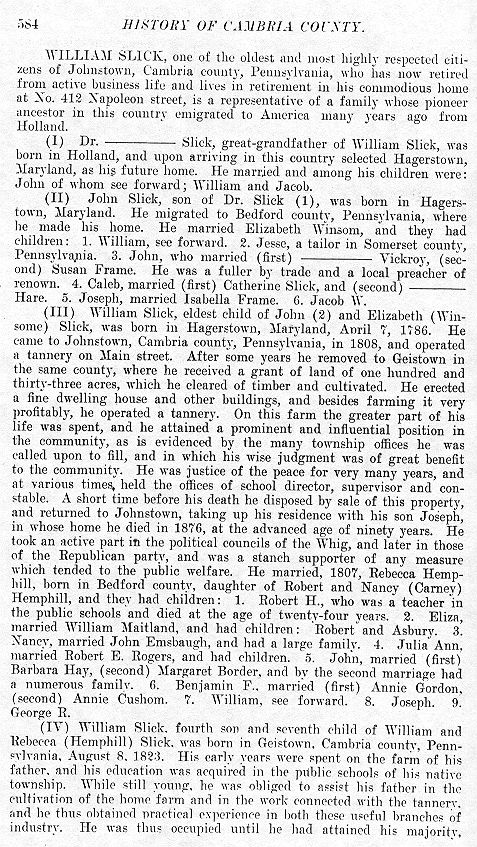 WILLIAM SLICK, one of the oldest and most highly respected citizens of Johnstown, Cambria county, Pennsylvania, who has now retired from active business life and lives in retirement in his commodious home at No. 412 Napoleon street, is a representative of a family whose pioneer ancestor in this country emigrated to America many years ago from Holland. (1.) Dr. ------ Slick, great-grandfather of William Slick, was born in Holland, and upon arriving in this country selected Hagerstown, Maryland, as his future home. He married and among his children were: John of whom see forward; William and Jacob. (II) John Slick, son of Dr. Slick (1), was born in Hagerstown, Maryland. He migrated to Bedford county, Pennsylvania, where he made his home. He married Elizabeth Winsom, and they had children: 1. William, see forward. 2. Jesse, a tailor in Somerset county, Pennsylvania. 3. John, who married (first) ------ Vickroy, (second) Susan Frame. He was a fuller by trade and a local preacher of renown. 4. Caleb, married (first) Catherine Slick, and (second) ------ Hare. 5. Joseph, married Isabella Frame. 6. Jacob W. (III) William Slick, eldest child of John (2) and Elizabeth (Winsome) Slick, was born in Hagerstown, Maryland, April 7, 1786. He came to Johnstown, Cambria county, Pennsylvania, in 1808, and operated a tannery on Main street. After some years he removed to Geistown in the same county, where he received a grant of land of one hundred and thirty-three acres, which he cleared of timber and cultivated. He erected a fine dwelling house and other buildings, and besides farming it very profitably, he operated a tannery. On this farm the greater part of his life was spent, and he attained a prominent and influential position in the community, as is evidenced by the many township offices he was called upon to fill, and in which his wise judgment was of great benefit to the community. He was justice of the peace for very many years, and at various times, held the offices of school director, supervisor and constable. A short time before his death he disposed by sale of this property, and returned to Johnstown, taking up his residence with his son Joseph, in whose home he died in 1876, at the advanced age of ninety years. He took an active part in the political councils of the Whig, and later in those of the Republican party, and was a stanch supporter of any measure which tended to the public welfare. He married, 1807, Rebecca Hemphill, born in Bedford county, daughter of Robert and Nancy (Carney) Hemphill, and they had children: 1. Robert H., who was a teacher in the public schools and died at the age of twenty-four years. 2. Eliza, married William Maitland, and had children: Robert and Asbury. 3. Nancy, married John Emsbaugh, and had a large family. 4. Julia Ann, married Robert E. Rogers, and had children. 5. John, married (first) Barbara Hay, (second) Margaret Border, and by the second marriage had a numerous family. 6. Benjamin F., married (first) Annie Gordon, (second) Annie Cushom. 7. William, see forward. 8. Joseph. 9. George R. (IV) William Slick, fourth son and seventh child of William and Rebecca (Hemphill) Slick, was born in Geistown, Cambria county, Pennsylvania, August 8, 1823. His early years were spent on the farm of his father, and his education was acquired in the public schools of his native township. While still young, he was obliged to assist his father in the cultivation of the home farm and in the work connected with the tannery, and he thus obtained practical experience in both these useful branches of industry. He was thus occupied until he had attained his majority, |