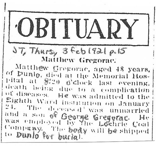 | MATTHEW GREGORAE. Matthew Gregorae, aged 48 years, of Dunlo, died at the Memorial Hospital at 8:20 o'clock last evening, beath being due to a complication of diseases. He was admitted to the Eighth Ward institution on January 24. The deceased was unmarried and a son of George Gregorae. He was employed by the Loehrle Coal Company. The body will be shipped to Dunlo for burial. |