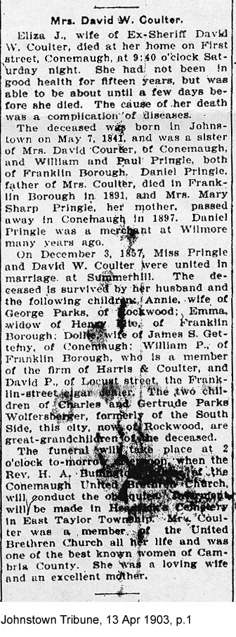 | Mrs. David W. Coulter. Eliza J., wife of Ex-Sheriff David W. Coulter, died at her home on First street, Conemaugh, at 9:40 o'clock Saturday night. She had not been in good health for fifteen years, but was able to be about until a few days before she died. The cause of her death was a complication of diseases. The deceased was born in Johnstown on May 7, 1841, and was a sister of Mrs. David Courter, of Conemaugh, and William and Paul Pringle, both of Franklin Borough. Daniel Pringle, father of Mrs. Coulter, died in Franklin Borough in 1891, and Mrs. Mary Sharp Pringle, her mother, passed away in Conemaugh in 1897. Daniel Pringle was a merchant at Wilmore many years ago. On December 3, 1857, Miss Pringle and David W. Coulter were united in marriage at Summerhill. The deceased is survived by her husband and the following children: Annie, wife of George Parks, of Rockwood; Emma, widow of Henry Fite, of Franklin Borough; Dollie, wife of James S. Gettemy, of Conemaugh; William P., of Franklin Borough, who is a member of the firm of Harris & Coulter, and David P., of Locust street, the Franklin-street cigar dealer. The two children of Charles and Gertrude Parks Wolfersberger, formerly of the South Side, this city, now of Rockwood, are great-grand-children of the deceased. The funeral will take place at 2 o'clock to-morrow afternoon when the Rev. H. A. Buffington, _____ of the Conemaugh United Brethren Church, will conduct the obsequies. Interment will be made in Headrick's Cemetery in East Taylor Township. Mrs. Coulter was a member of the United Brethren Church all her life and was one of the best known women of Cambria County. She was a loving wife and an excellent mother. |